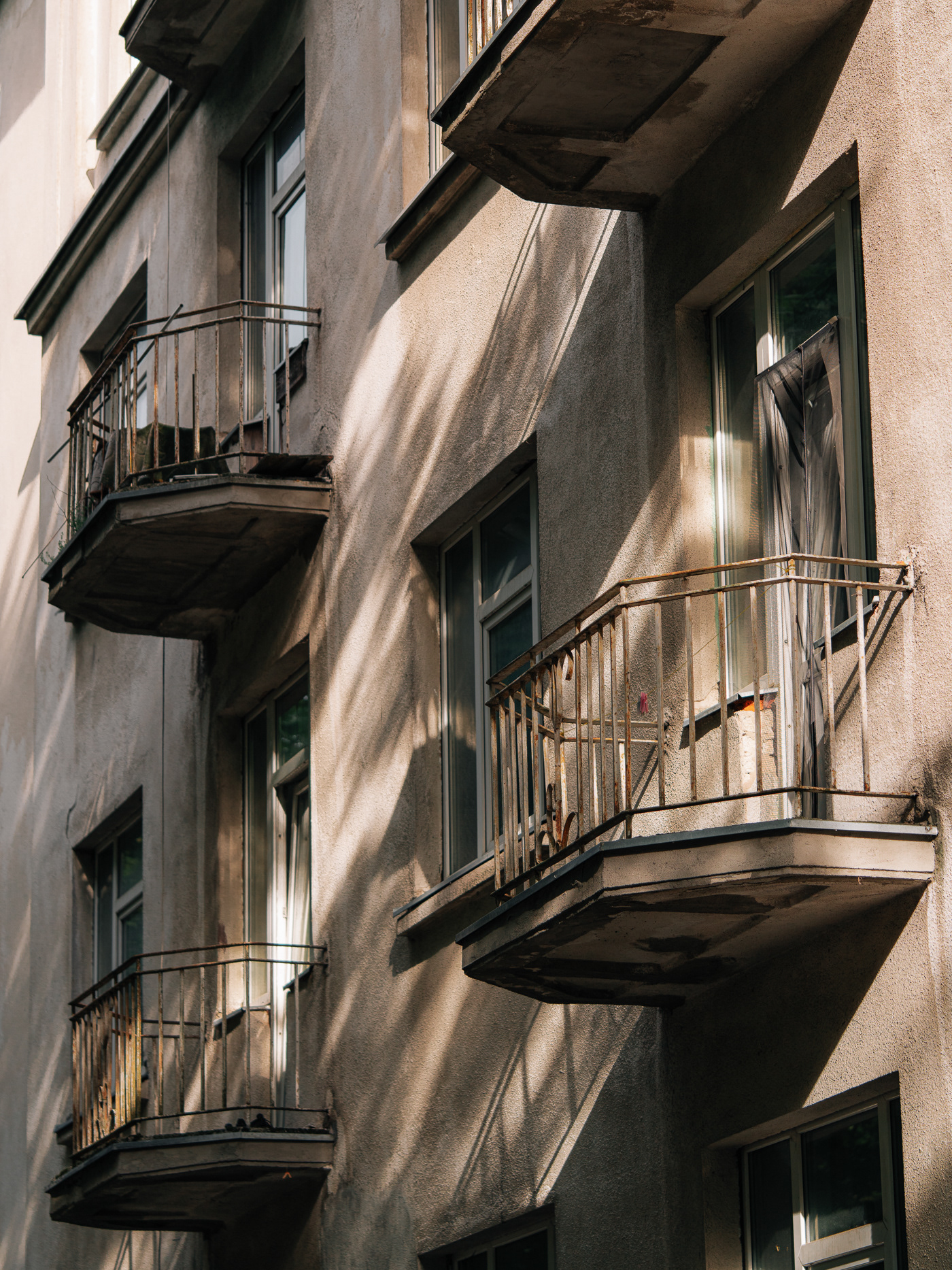 This is part 2 of my project. Here I concentrate on entrances to buildings and their balconies. Unfortunately many of the original doors are long gone, but the ones that are still there could tell many tales if it could speak... so it's speaks with peeled off paint, crooked wood and hardly working handles. And the balconies had many visitors in years, not all of them can accept them anymore.